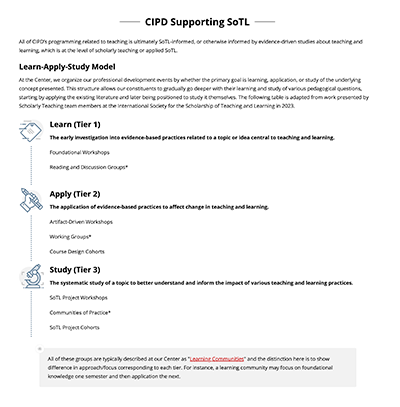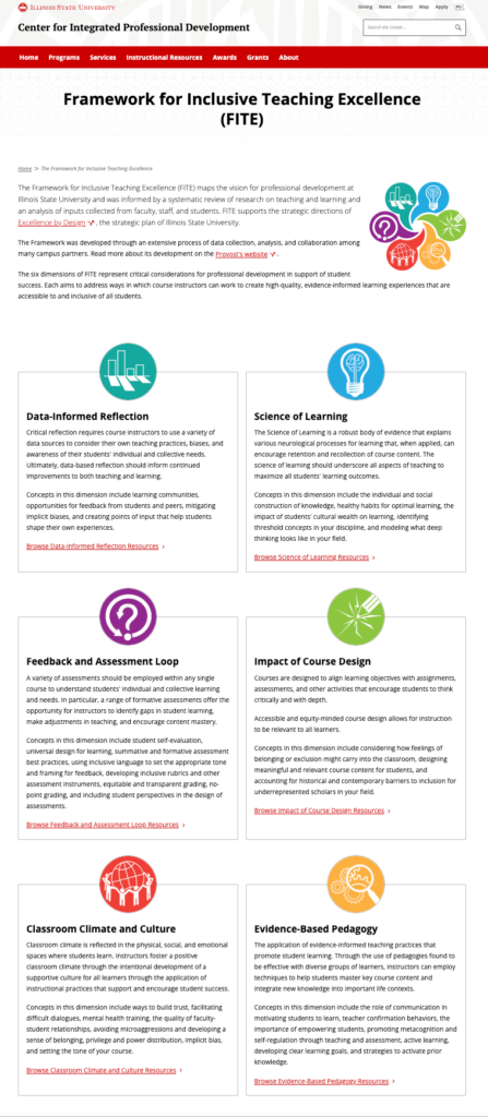 Illinois State University uses a CMS called Modern Campus. I have Admin access so I am able to customize pages. The Center for Integrated Professional Development’s site is an active site and provides resources for faculty. I create custom pages within the limitations of the CMS. I also use assets to globally update identical content on multiple pages.